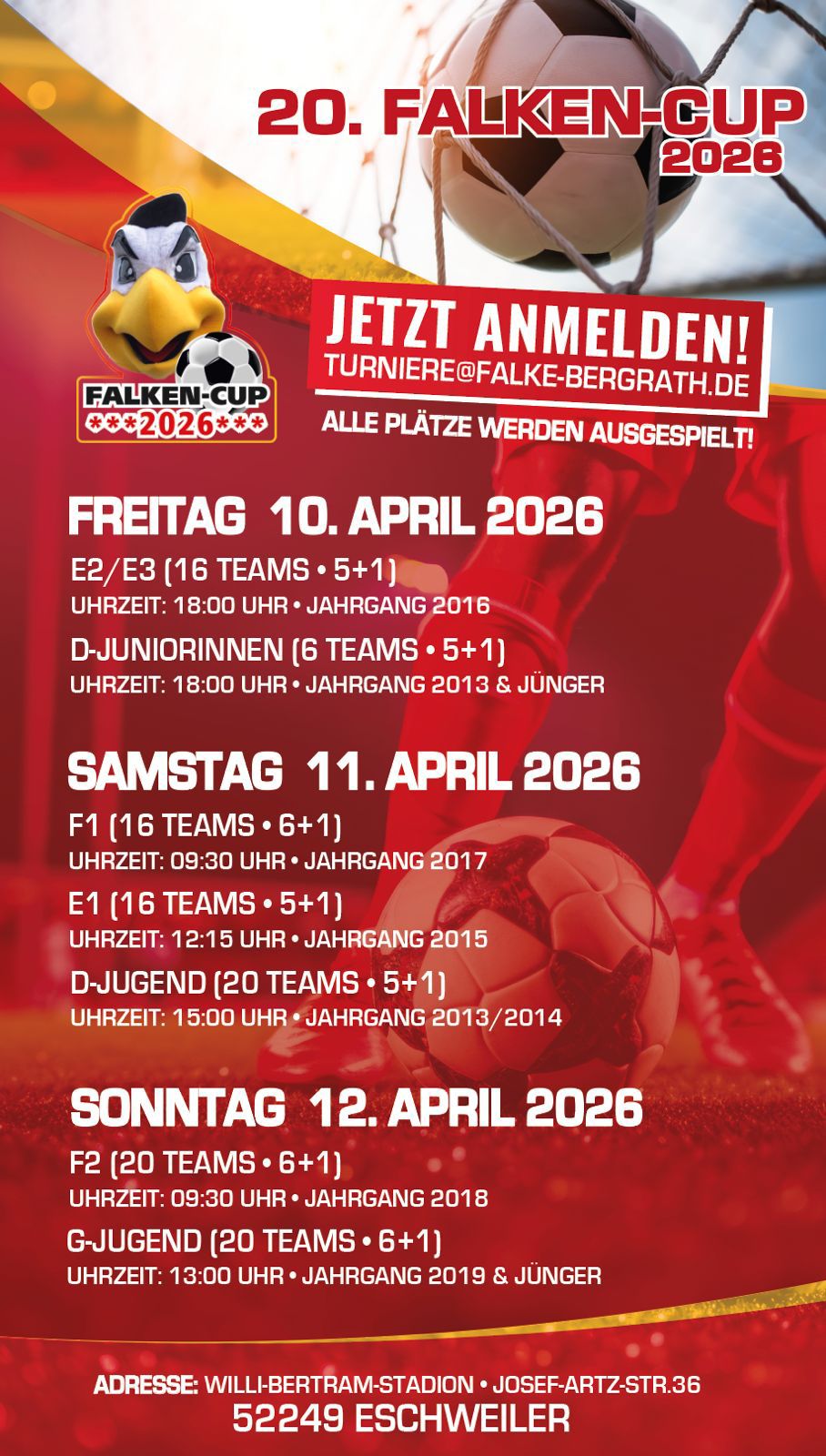Von Freitag, 14. April, bis Sonntag, 16. April, ist die Interessengemeinschaft zur Förderung der Jugend im SV Falke Bergrath Ausrichter des 17. Falken-Cups. Sieben Einzelturniere für G- bis D-Junioren sowie für D-Juniorinnen stehen dann im Willi-Bertram-Stadion auf dem Programm. 114 Mannschaften aus dem gesamten Rheinland haben sich zum Falken-Cup angemeldet.
